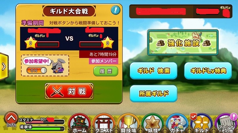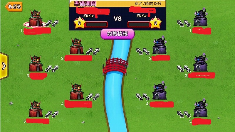右下のギルドボタンを押すと上記の画面に遷移します。 ※ここでは既に対戦相手が決まっている状態です。
