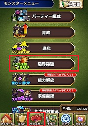下の「モンスター」ボタンを押してから「限界突破」を押します。